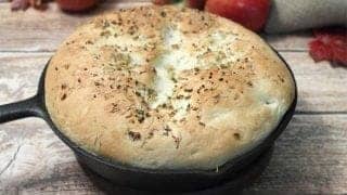 Just think -warm homemade bread, rich with the flavors of garlic and rosemary, fresh out of the oven, dripping with butter… Need I say more? This Garlic Rosemary Skillet Bread recipe is so easy anyone can make it. It’s just mix, one rise and bake to golden brown deliciousness.