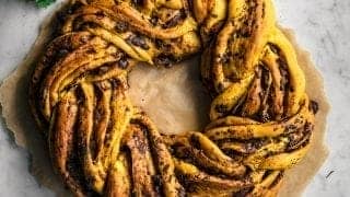 This is a spelt based, vegan version of a festive classic, the saffron wreath. Saffron adds a beautiful golden colour and rich flavour to this bread, which is filled with dark chocolate, dates, and coconut sugar.