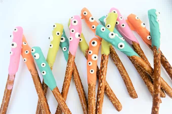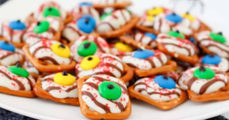 Halloween Pretzel Monster Eyeballs are a fun and spooky treat made by combining pretzels, candy melts, and candy eyeballs to create an irresistibly creepy snack.