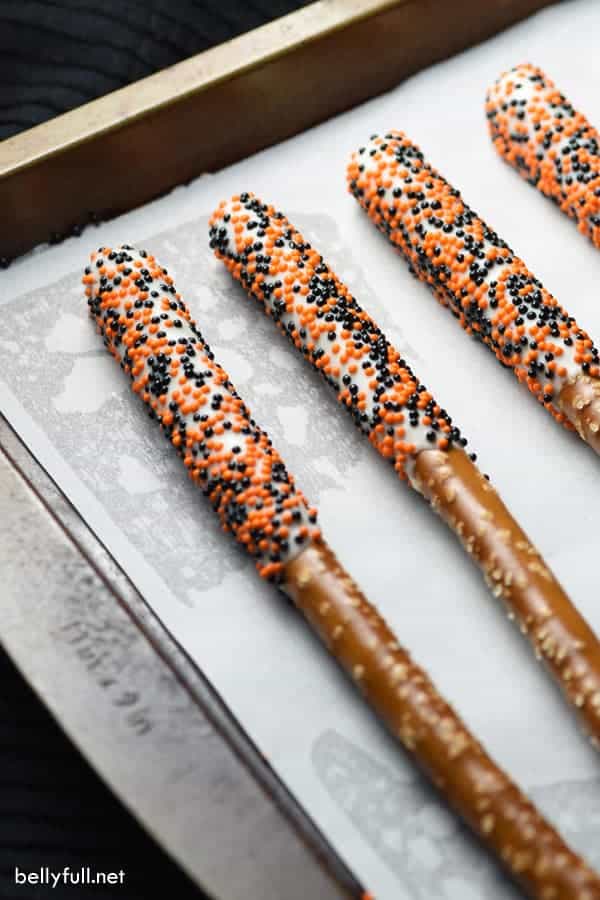 Halloween Pretzel Rods are a festive treat, often dipped in chocolate and decorated with spooky-themed sprinkles or icing.