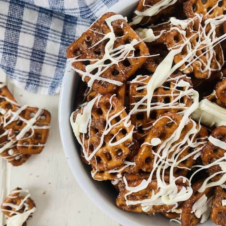 Pumpkin spiced pretzels with white chocolate drizzle combine the warm, aromatic flavors of fall with a sweet, creamy finish for the perfect seasonal treat.