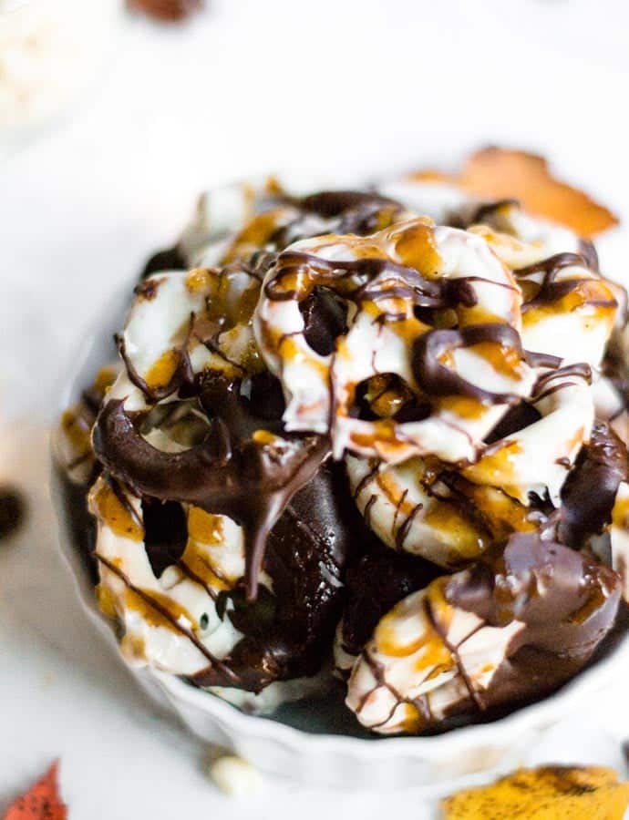 White chocolate covered pretzels with pumpkin spice caramel offer a perfect balance of sweetness and spice, creating a delightful treat for autumn indulgence.